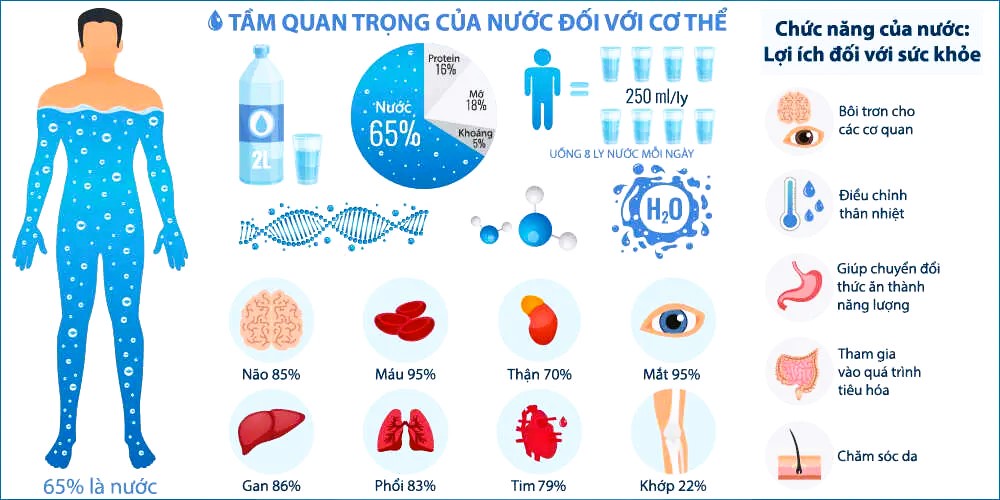 Nước chiếm đến tỉ lệ 70-80% trọng lượng cơ thể. Nước có khả năng cung cấp nguồn khoáng chất, vận chuyển chất dinh dưỡng, oxy cần thiết cho các tế bào, nuôi dưỡng tế bào trong mọi hoạt động của cơ thể. Nước sạch có chứa nhiều chất khoáng có lợi cho sức khỏe.